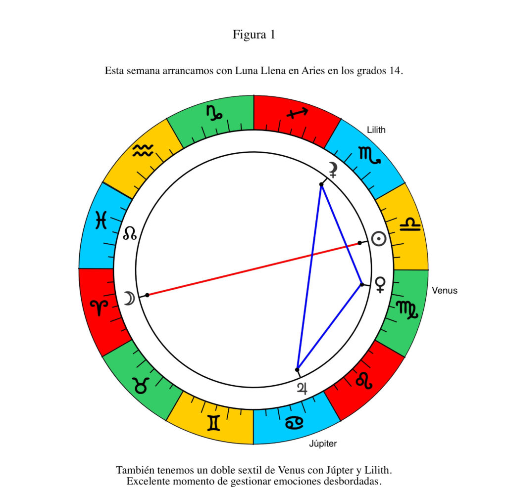 Esta semana se forma un efímero triángulo entre Venus, Júpiter y Lilith. En su recta final en Virgo, Venus, hace esta bella figura armoniosa con los dos signos de agua complementarios a Virgo. Al estar Venus en la cabeza y en Virgo, significa que es la ecuanimidad, la practicidad, el realismo, la organización, el orden y la belleza del detalle y la pequeña perfección, lo que le dará salida a emociones, intensas de intimidad, pertenencia y nutrición desde Cáncer y al ímpetu liberador de Lilith en Escorpio.